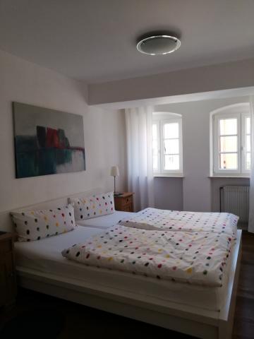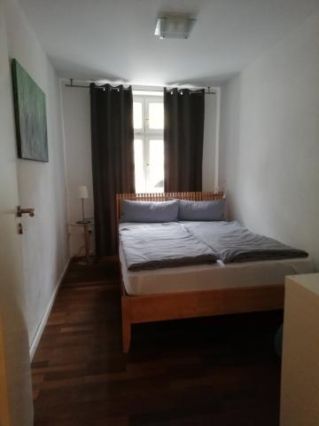 Die zwei Schlafzimmer (eines mit Doppelbett, eines mit zwei Einzelbetten und einer zusätzlichen Schlafmöglichkeit am Boden) liegen zur Straße hin (Schallschutzfenster, Blick zu den Domtürmen), die direkt in die Innenstadt führt (8 Min. zu Fuß zum historischen Rathaus/ 10 Min. zum Dom), und der große Wohnraum mit Vollholzküchenzeile, Essplatz und Sofaecke zeigt zum sonnigen ruhigen Innenhof, der recht ansprechend gestaltet ist. Auch hier führt die Glastür auf einen ruhigen Balkon.