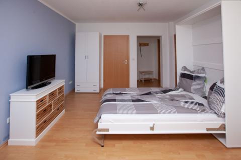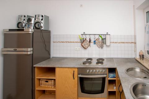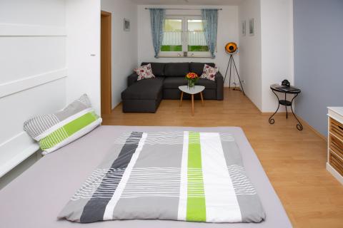 Neben dem geräumigen Schlafzimmer bietet die Wohnung eine gemütliche Küche, ein großes Bad, ein Wohnzimmer mit riesiger Kuschelcouch, sowie weitere Schlafgelegenheiten im Spitzboden, ein wunderbarer Rückzugsort für Jugendliche.